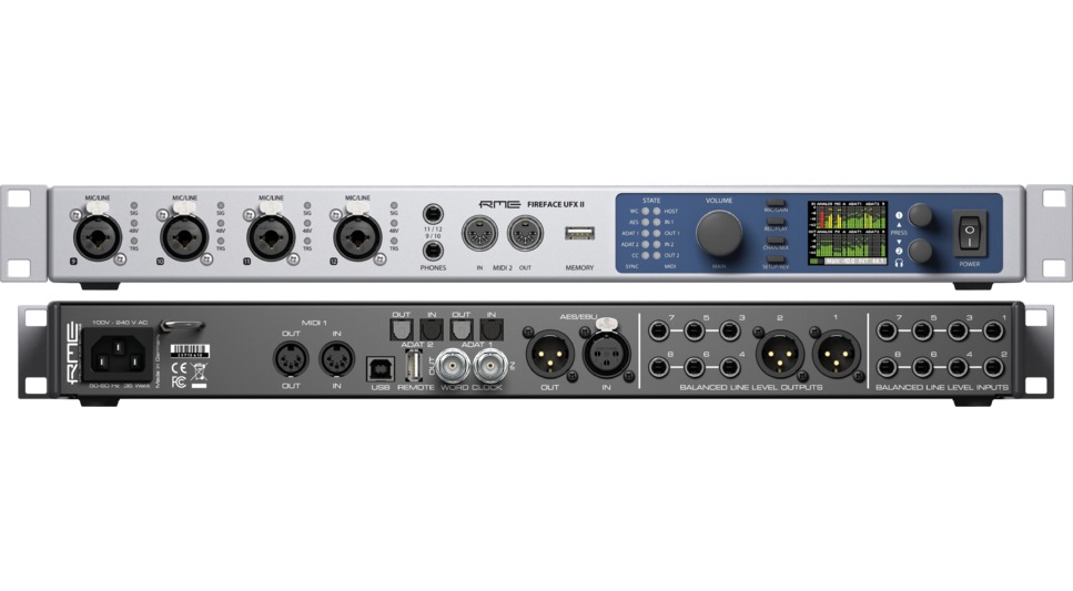 La Fireface UFX II propose une excellente flexibilité permettant à l'interface de s'intégrer aisément dans un grand nombre d'environnements de production. Analogique, ADAT, AES, SPDIF, et USB 2 sont présents en standard sur la Fireface UFX II. Le nombre de canaux est également impressionnant : 12 analogiques, 16 ADAT, et 2 AES pour un total de 30 canaux d'entrée et 30 de sortie. De plus, avec la connectivité USB 2, la nouvelle Fireface UFX II peut se voir adjoindre la télécommande optionnelle ARC USB de RME.
